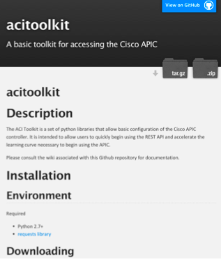 One more example of tool for DevOps is the ACI toolkit, a set of python libraries that expose the ACI network fabric to DevOps as a code library.